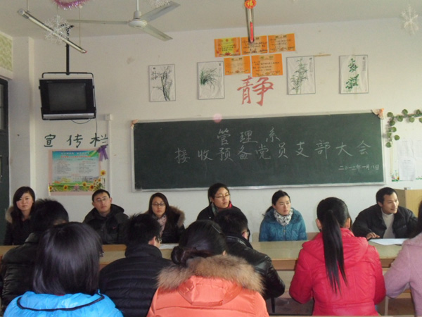 2013年1月8日中午11點30分我系在科技樓404教室召開接收預備黨員支部大會。此次大會有我系黨總支副書記錢曼麗老師、學生支部書記高彩霞老師、教工支部書記馬超老師,入黨積極分子參加了會議。