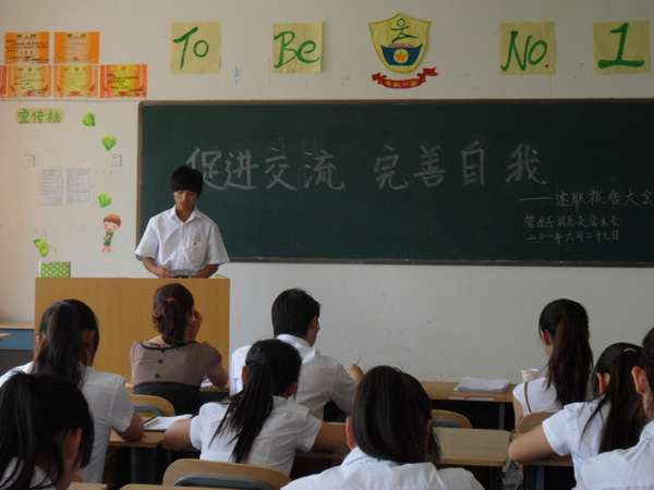 團總支書記張代玉對大家這一年的努力工作及取得成績表示充分的肯定,同時還指出大家工作中仍然存在的一些問題,張老師希望同學們在以后工作中能盡量處理好學習和工作之間的關系,踏實工作,完善自我。