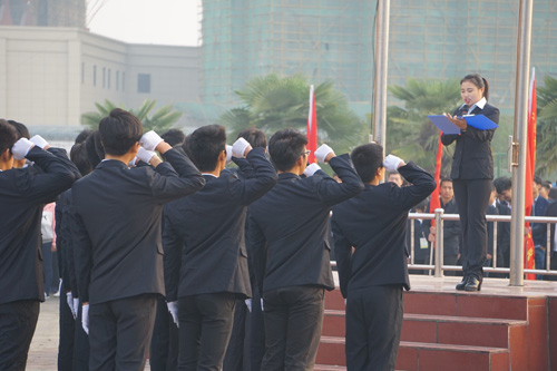 隨著整齊的步伐和嘹亮的口號,國旗護衛(wèi)隊隊員們護衛(wèi)著鮮紅的五星紅旗莊嚴的步入廣場。在莊嚴的國歌聲中,在場老師和同學集體行注目禮,神情肅然的看著國旗冉冉升起,全場莊嚴肅穆。之后,學生代表陳淼帶領大家莊嚴宣誓。