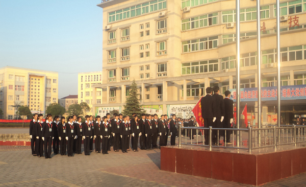 由系學生會組成的國旗護衛(wèi)隊,昂首挺胸邁著鏗鏘有力的步伐緩緩走來,靜候在兩旁的同學們凝望著鮮艷的五星紅旗,敬意油然而生,整個廣場顯的莊嚴而肅穆。