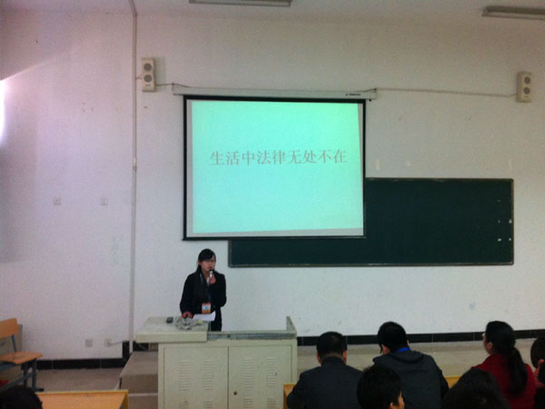 生活中處處存在法律、體現(xiàn)法律。劉微老師以《法律和生活》為第十講的演講主題。劉老師把枯燥的法律條文用通俗的語言和生動的事例講述的淺顯易懂。整個現(xiàn)場氣氛活躍,大家因?yàn)閯⒗蠋煹木恃葜v而不時的報以熱烈的掌聲。本次講座旨在告誡大學(xué)生要增強(qiáng)法制觀念,在以后的生活中學(xué)會用法律武器維護(hù)自己的合法權(quán)益。