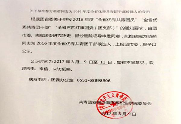 關(guān)于擬推薦方萌萌同志為2016年度全省優(yōu)秀共青團(tuán)干部候選人的公示